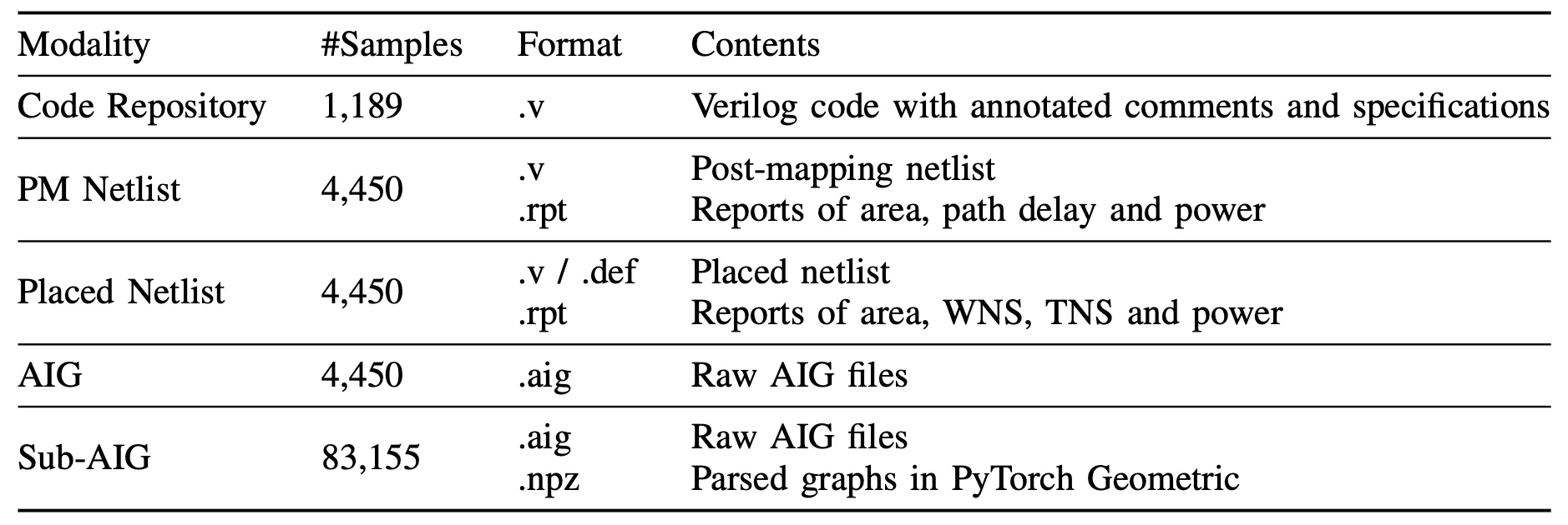 We employ Synopsys Design Compiler ® and 12nm Process Design Kit (PDK) to synthesize RTL code repositories into post-mapped (PM) netlists, along with detailed synthesis reports.